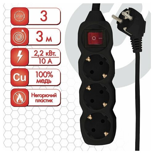 Удлинитель сетевой SONNEN U-133GS, 3 розетки, c заземлением, выключатель, 10 А, 3 м, черный, 513266 (арт. 513266)