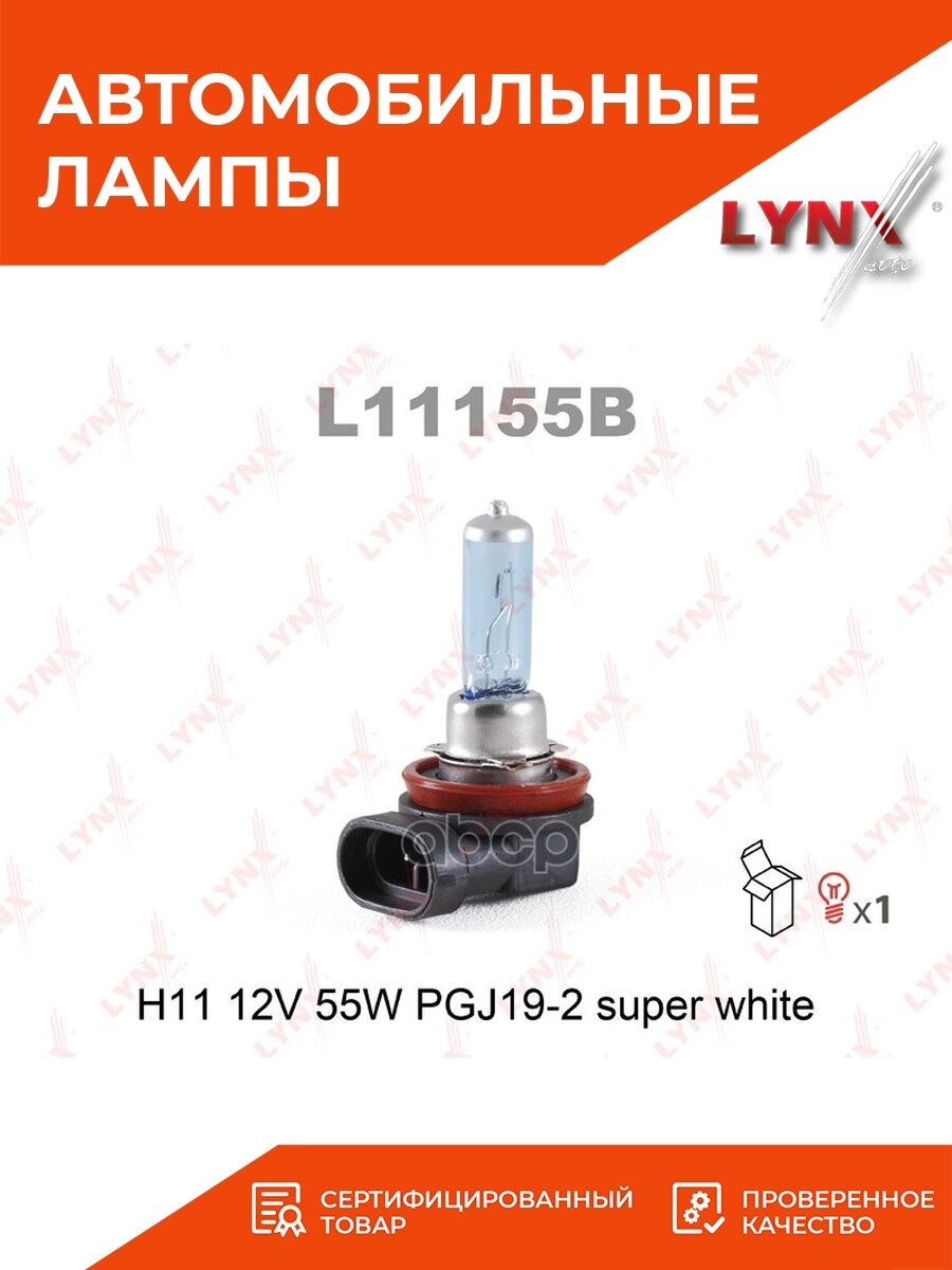 Лампа галогенная LYNXAuto Super White H11 (PGJ19-2, T11), 12В, 55Вт, 4200К, 1 шт, арт. L11155B 551 ₽