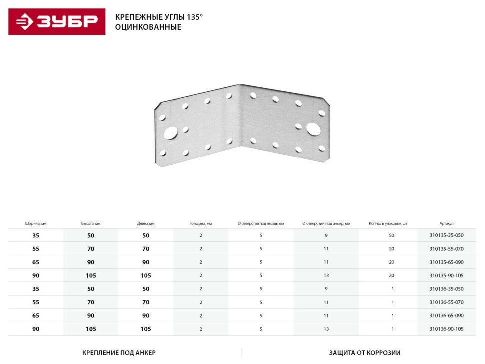 ЗУБР Уголок крепежный 135град. УК-135-2.0, 65х90х90 х 2мм, ЗУБР, ( 310136-65-090 ) информация: