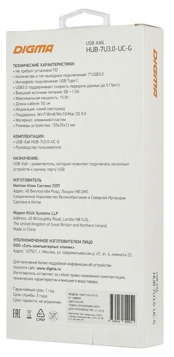 Разветвитель USB-C Digma HUB-7U3.0-UC-G серый информация: