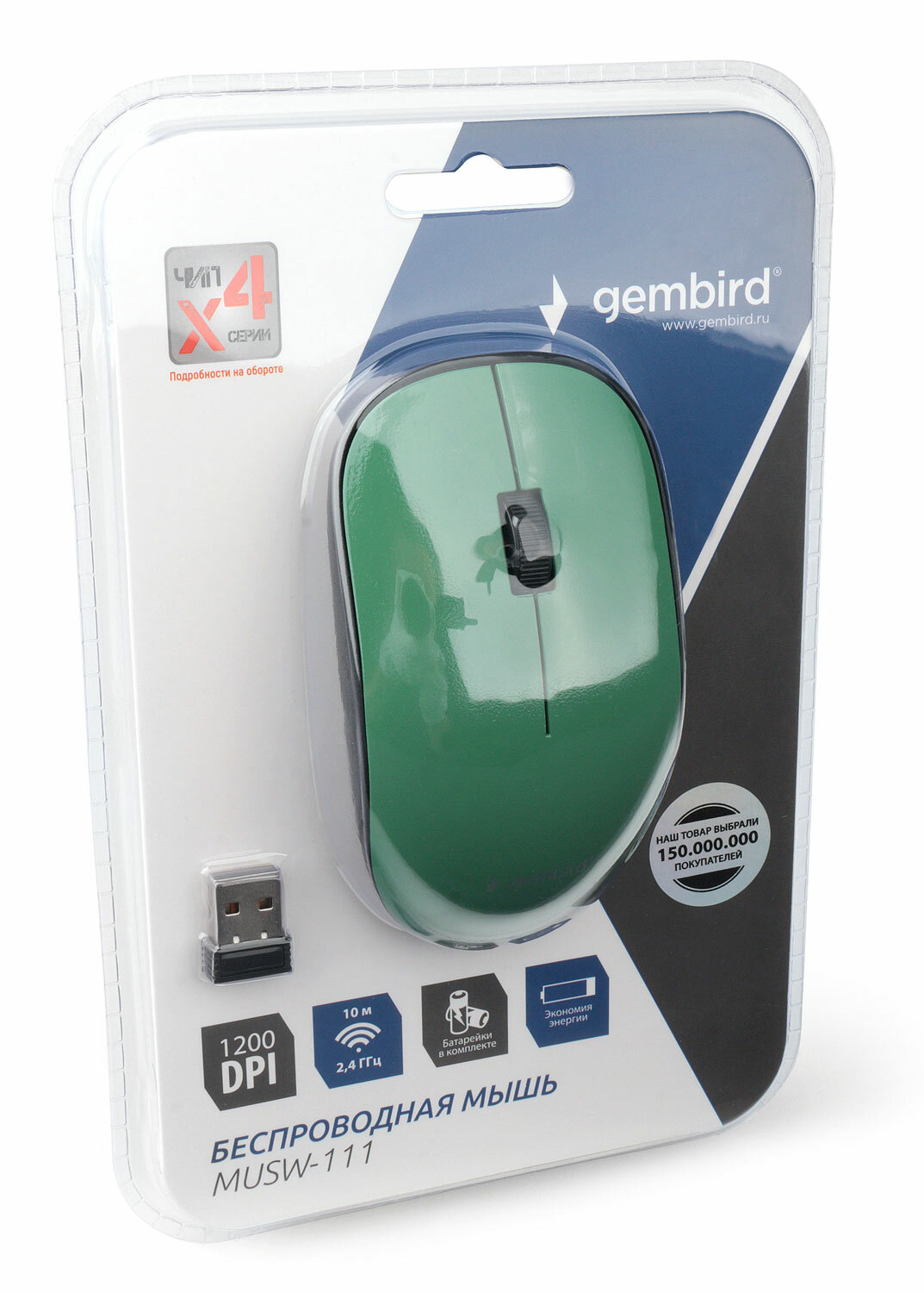 Мышь Gembird MUSW-111-GRN, беспроводная, оптическая, 1200 dpi, 2.4 ГГц, 1хAA, USB, зелёная информация: