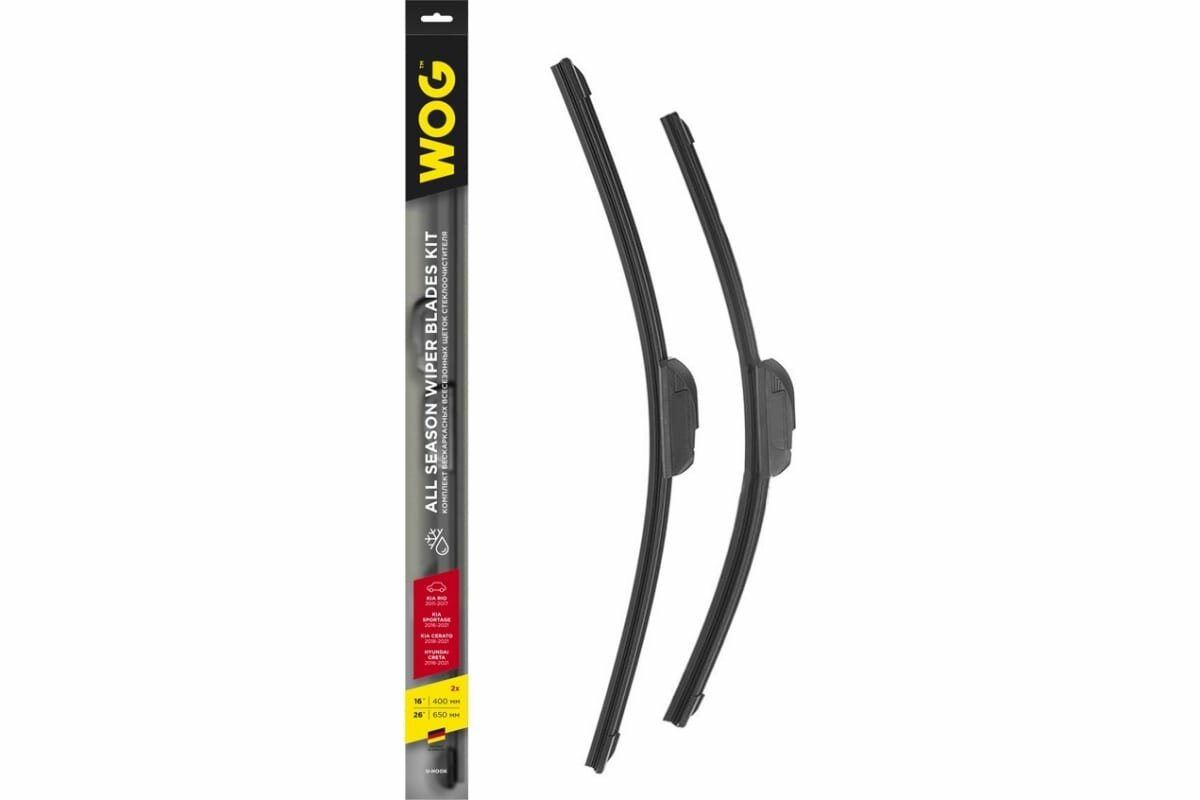 Комплект всесезонных бескаркасных бесшумных щеток стеклоочистителя 650мм/26"+400мм/16" (RIO/SPORTAGE/CRETA/CERATO) с креплением "HOOK" WOG, 2 шт.