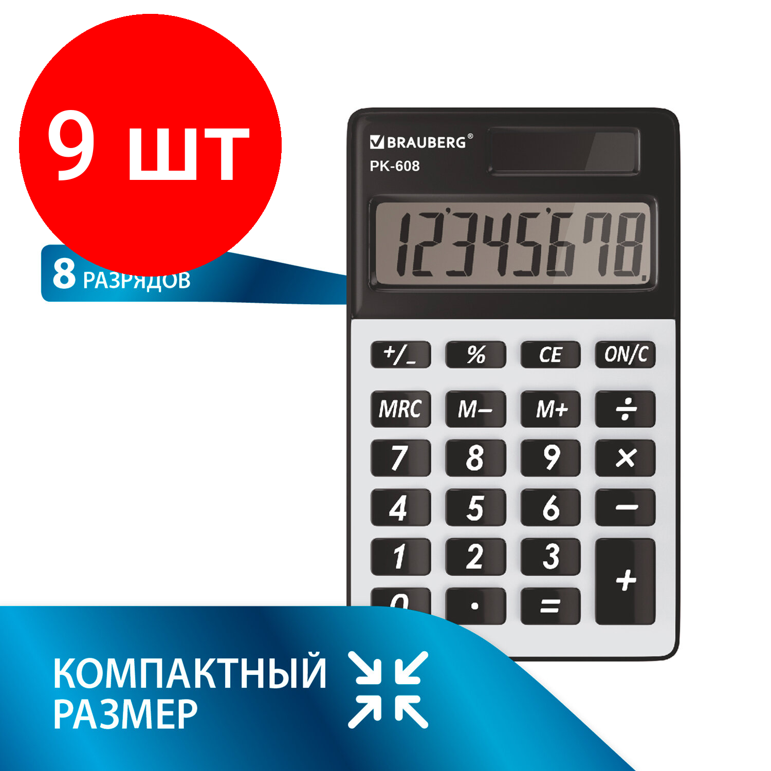 Комплект 9 шт, Калькулятор карманный BRAUBERG PK-608 (107x64 мм), 8 разрядов, двойное питание, серебристый, 250518 информация: