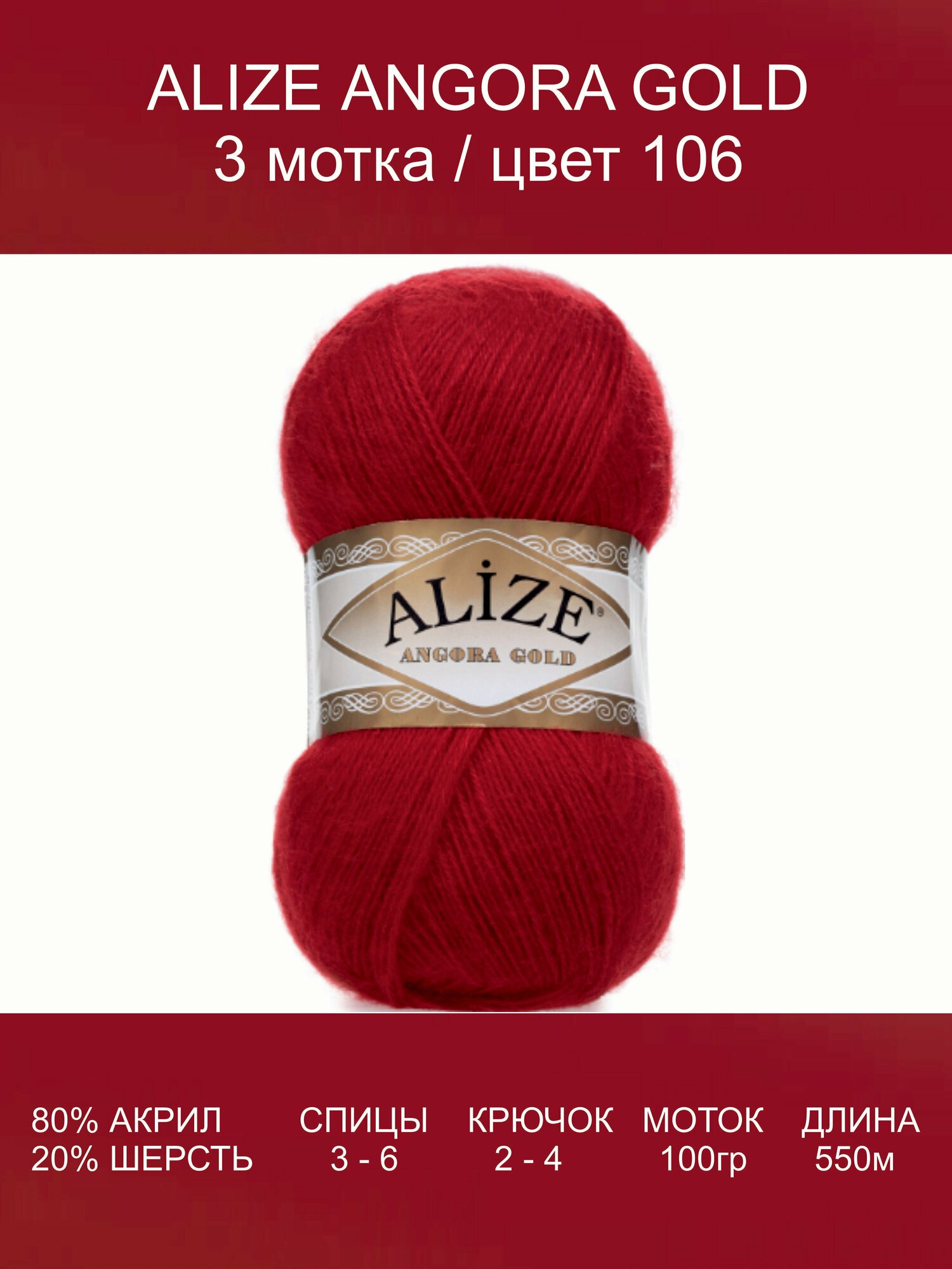 Пряжа Alize Angora gold (Ангора голд) цвет: 106 красный, 100гр. 550м. (20% шерсть, 80% акрил), 3 шт. информация: