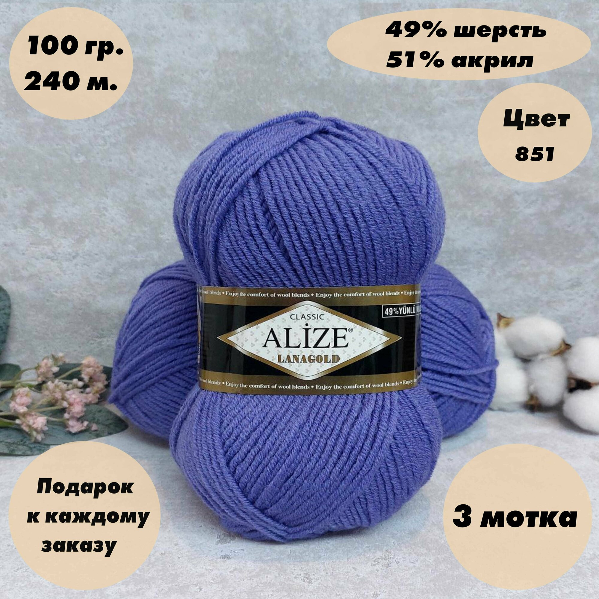 Пряжа Alize Lanagold сиреневый (851), 51%акрил/49%шерсть, 240м, 100г, 3шт информация: