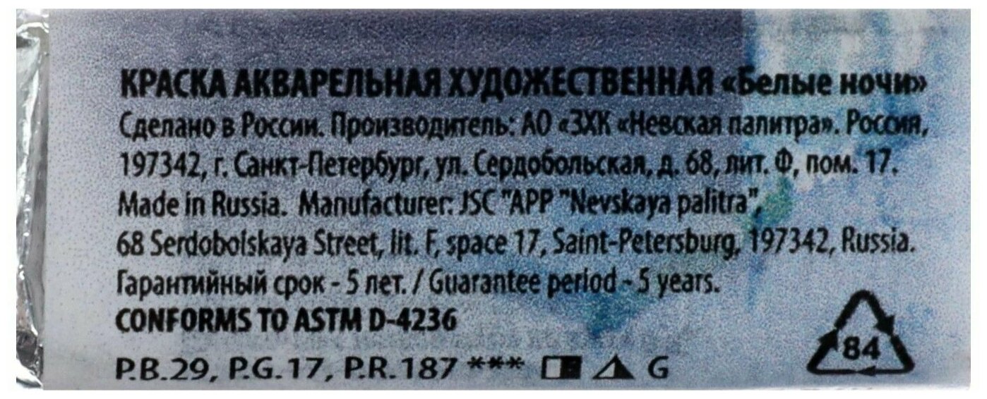 Завод художественных красок «Невская палитра» Акварель художественная "Белые ночи", 2.5 мл, лазурная мгла, в кювете