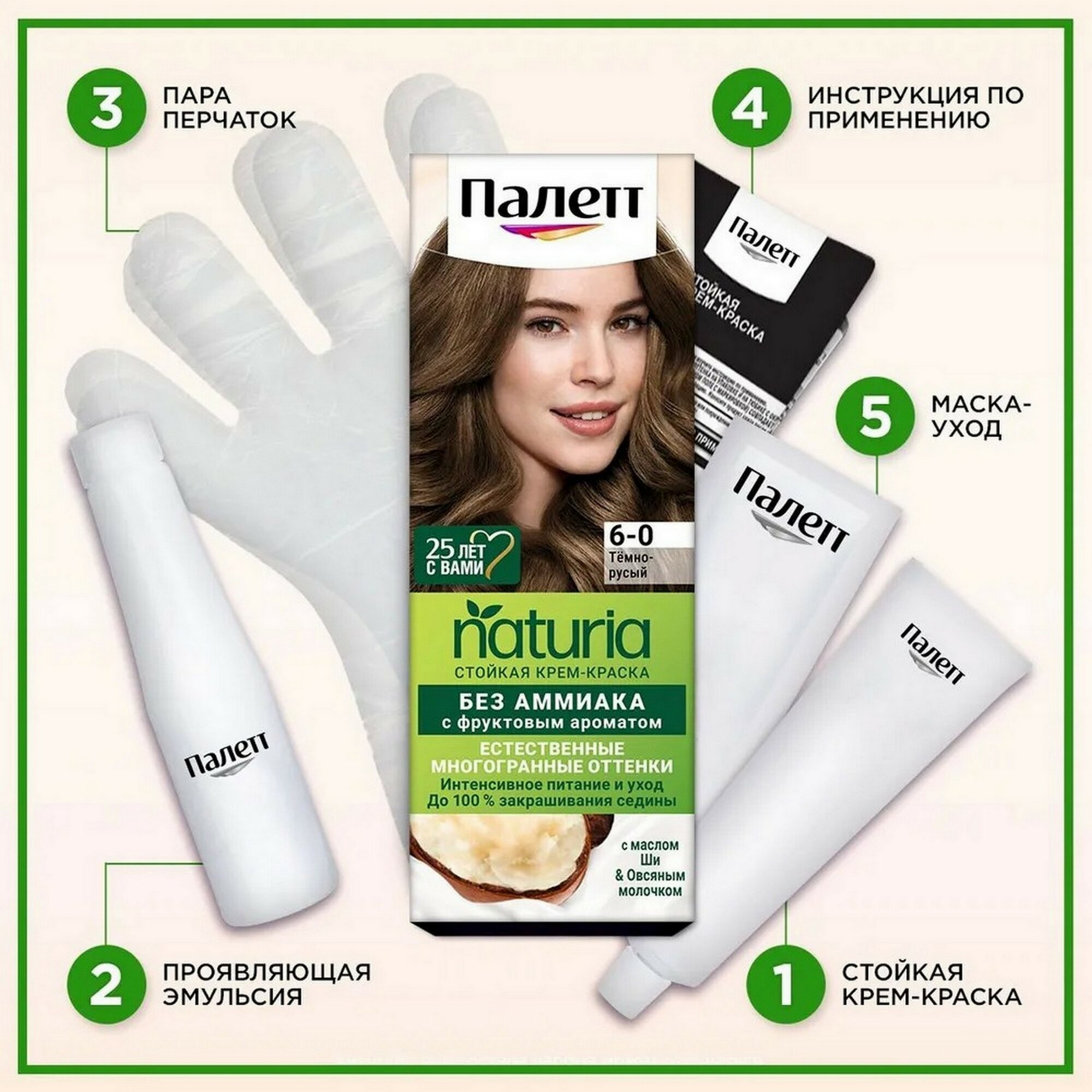 Палетт Naturia Стойкая крем-краска для волос, 6-0 Темно-русый, 110 мл - 6 шт 1 593 ₽