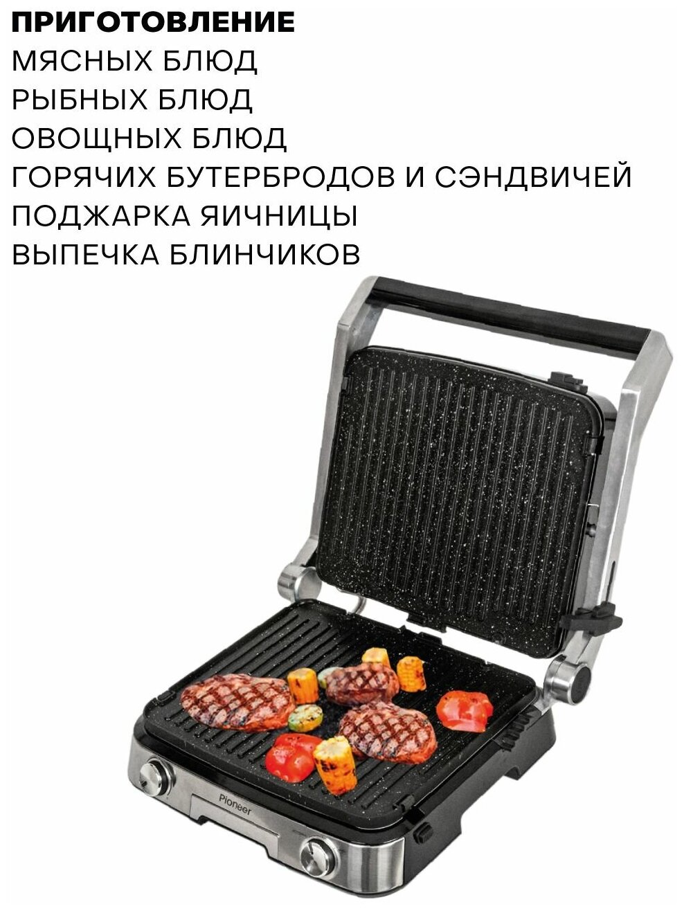 Гриль электрический Pioneer с утолщенными антипригарными панелями, 2 рабочих положения: гриль-пресс и открытие на 95 градусов, 6 режимов, 1400 Вт