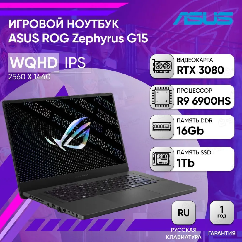 Ноутбук ASUS ROG ZEPHYRUS G15 2022 GA503RS-HQ067 90NR0AY2-M00560 (15.6", Ryzen 9 6900HS, 16 ГБ/ SSD 1024 ГБ, GeForce® RTX 3080 для ноутбуков) Серый информация: