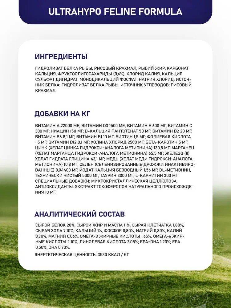 | Состав | гидролизат белка рыбы, рисовый крахмал, рыбий жир, карбонат кальция, фруктоолигосахариды (0,6%), хлорид калия, кальция сульфат дигидрат, монодикальций фосфат, натрия хлорид, экстракт календулы (источник лютеина) |