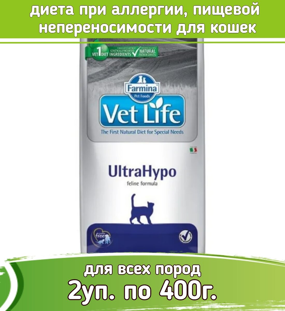 Cухой корм Farmina Vet Life UltraHypo для кошек, для кошек при пищевой аллергии или непереносимости ингредиентов и питательных веществ, Фармина Вет Лайф лечебный рацион со вкусом рыбы, 2шт по 400г