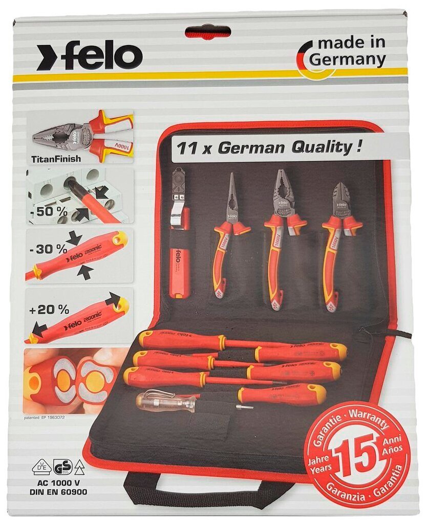Набор диэлектрических отверток Felo SL/PH/PZ E-Slim ERGONIC, бокорезов, плоскогубцев, длинногубцев, стриппера и отвертки тестера напряжения сети в сумке