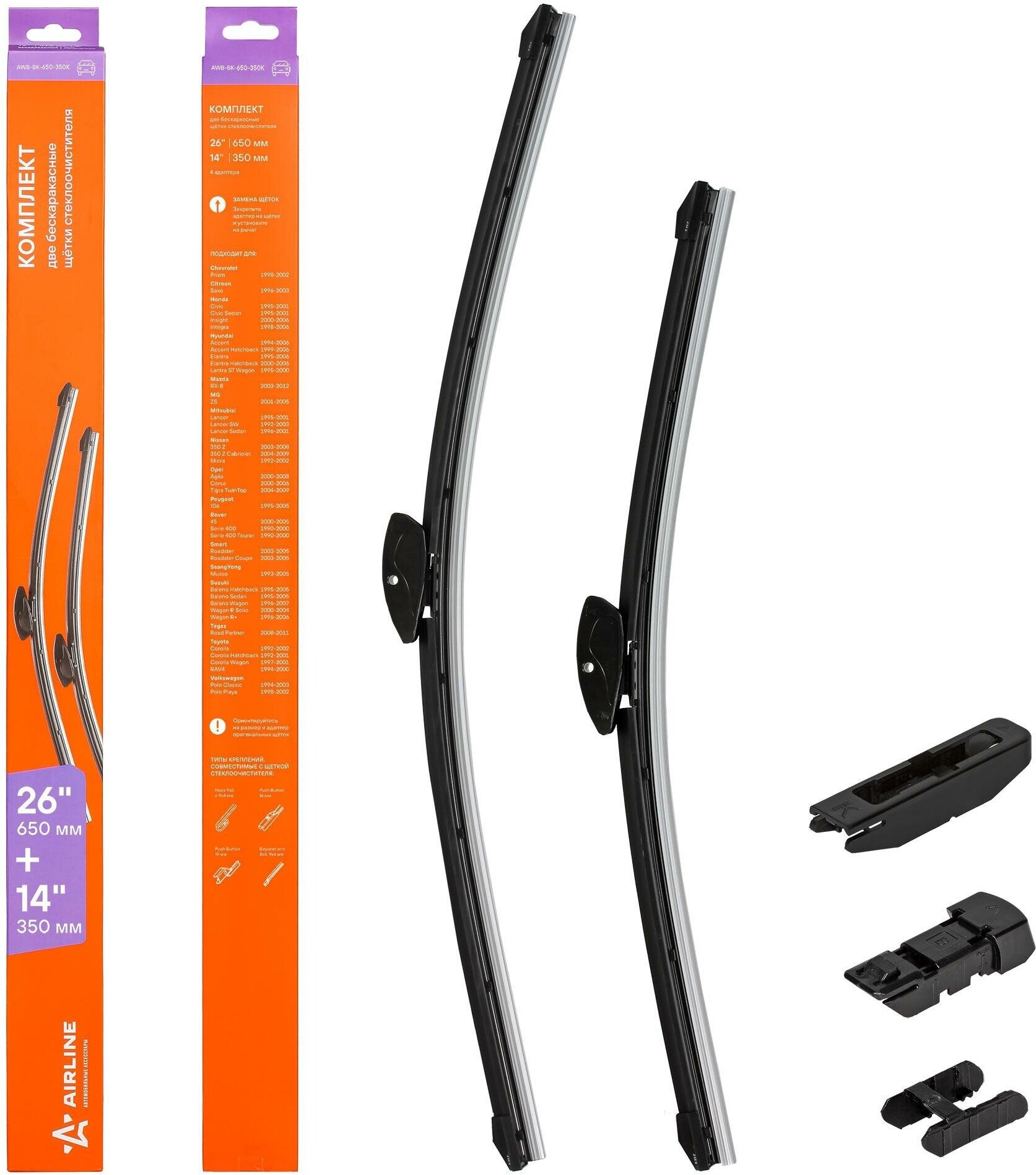 Щетки стеклоочистителя 650/350 мм (26/14) бескаркасные, 2 шт. 4 адаптера, airline, awbbk650350k