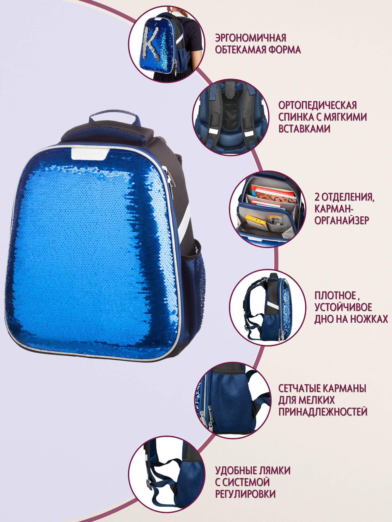 Ранец №1SCHOOL 843408 Sparkle Blue двусторонние пайетки эргономичная спинка