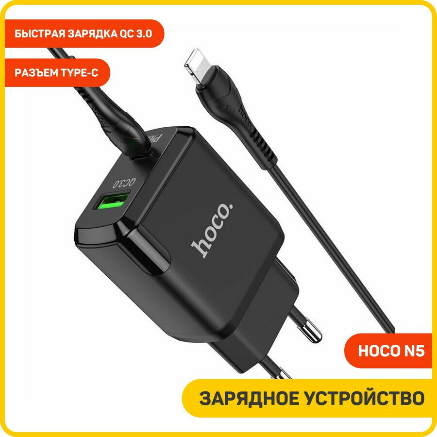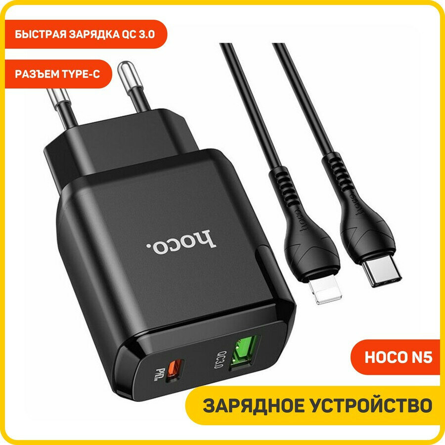 Сетевое зарядное устройство (СЗУ) Hoco N5 (USB/Type-C) + кабель Type-C-Lightning, 3 А, черный информация: