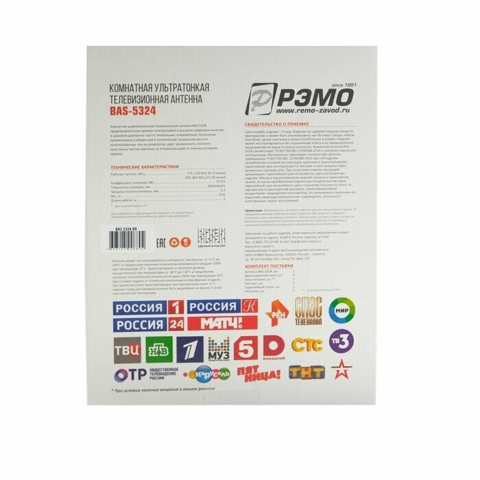 Антенна "РЭМО" BAS-5324-DX, комнатная, активная, 33 дБи, 5В, DVB-T2, цифровая 4515375 информация: