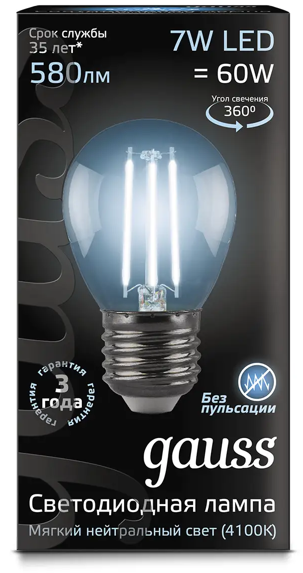 Отзывы на Лампочка светодиодная Е27 Шар 7W нейтр белый свет 4100K упаковка 10 шт. Gauss Filament