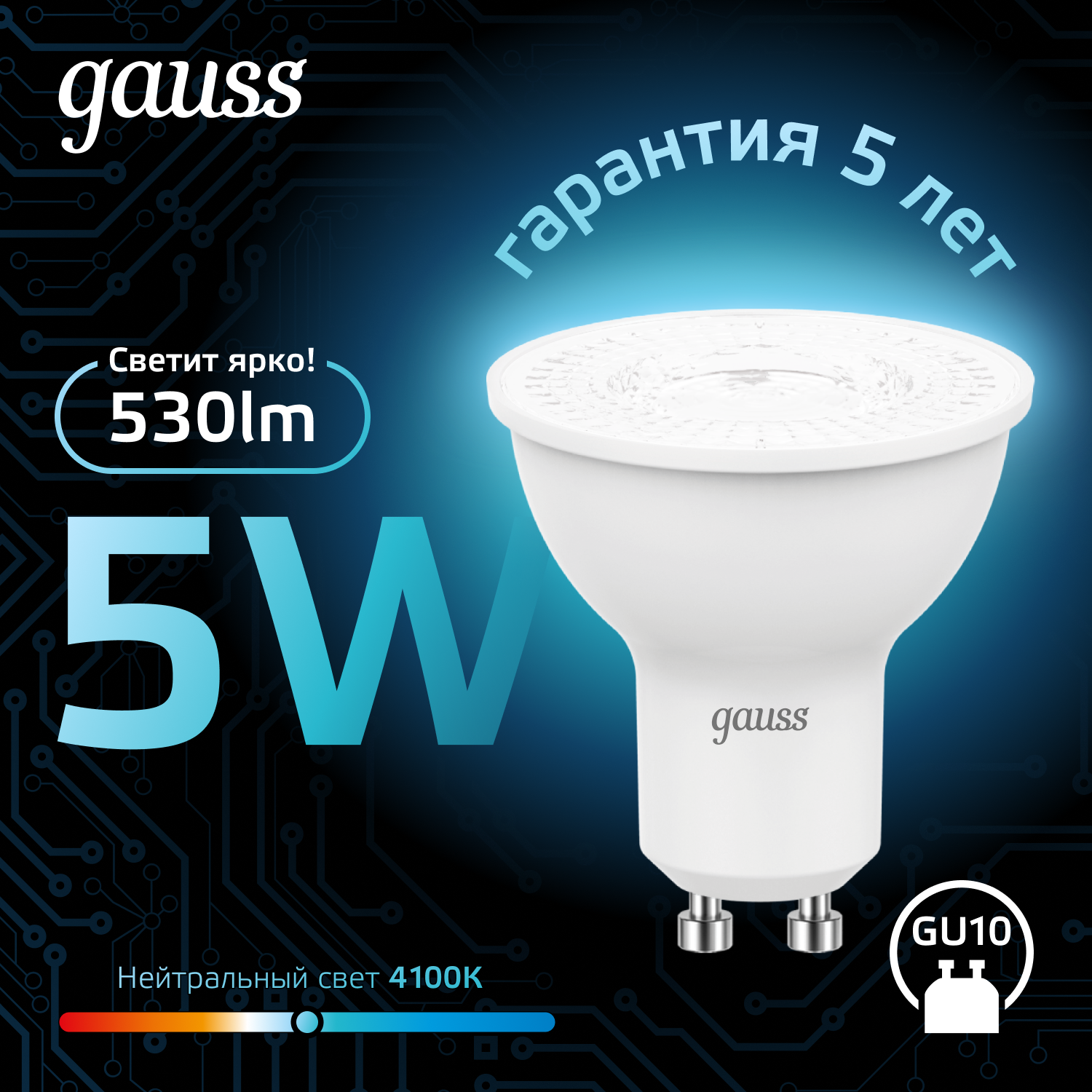 Лампочка светодиодная MR16 GU10 5W нейтр белый свет 4100K упаковка 10 шт. Gauss информация: