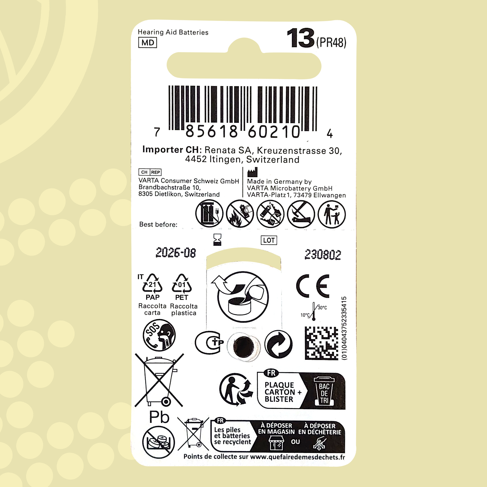 Renata 13 (ZA13/Оранжевый) | 1,45 вольт Воздушно-цинковая батарейка для слуховых аппаратов - 24шт. информация: