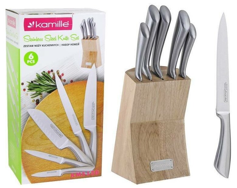 Набор ножей 6 предметов из нержавеющей стали Kamille KM-5130 на деревянной подставке (6)