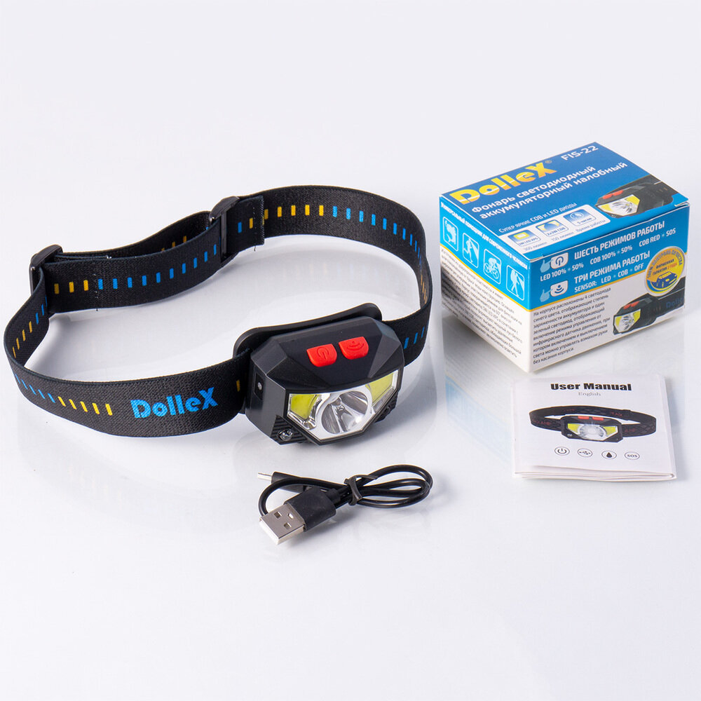 DOLLEX FIS22 Фонарь DOLLEX налобный аккум Li-POL 3.7V 1000mA COB 5W+LED3W датчик движения стробоскоп 4 710 ₽