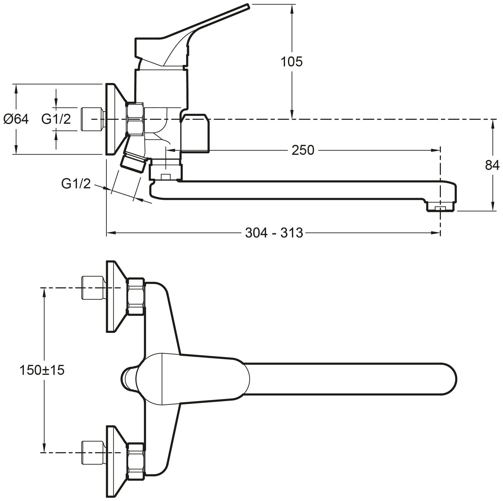 Смеситель на раковину настенный Эверест B46-350 с круглым поворотным изливом, кран-буксы 1/2", хром