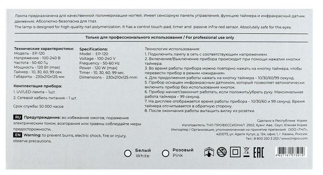 Лампа для гель-лака TNL Easy Pro, UV/LED, 120 Вт, 36 диодов, таймер 10/30/60/99 с, белая информация: