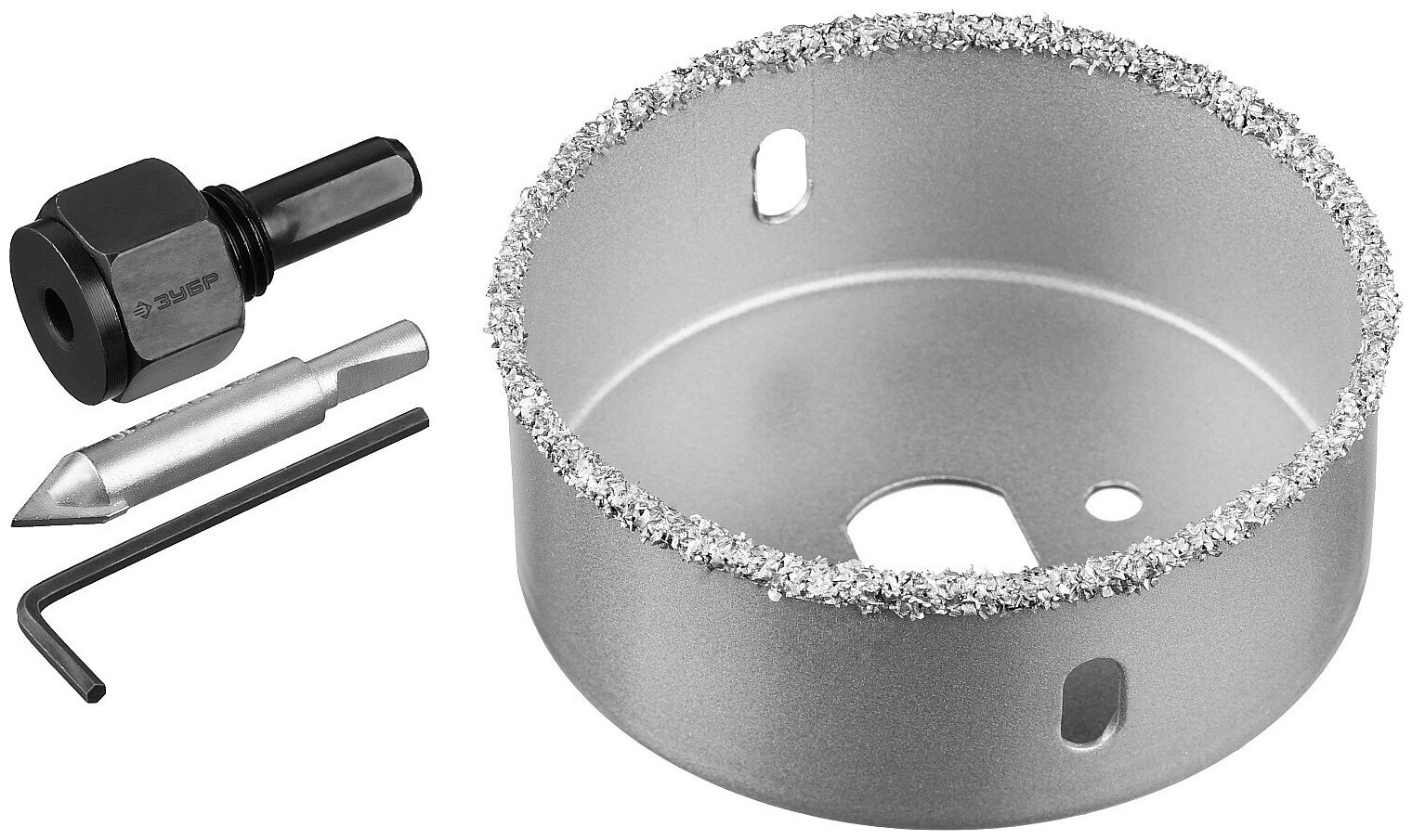 Коронка-чашка ЗУБР "Профессионал" c карбид-вольфрамовым нанесением, 76 мм, высота 25 мм, в сборе с державкой и сверлом