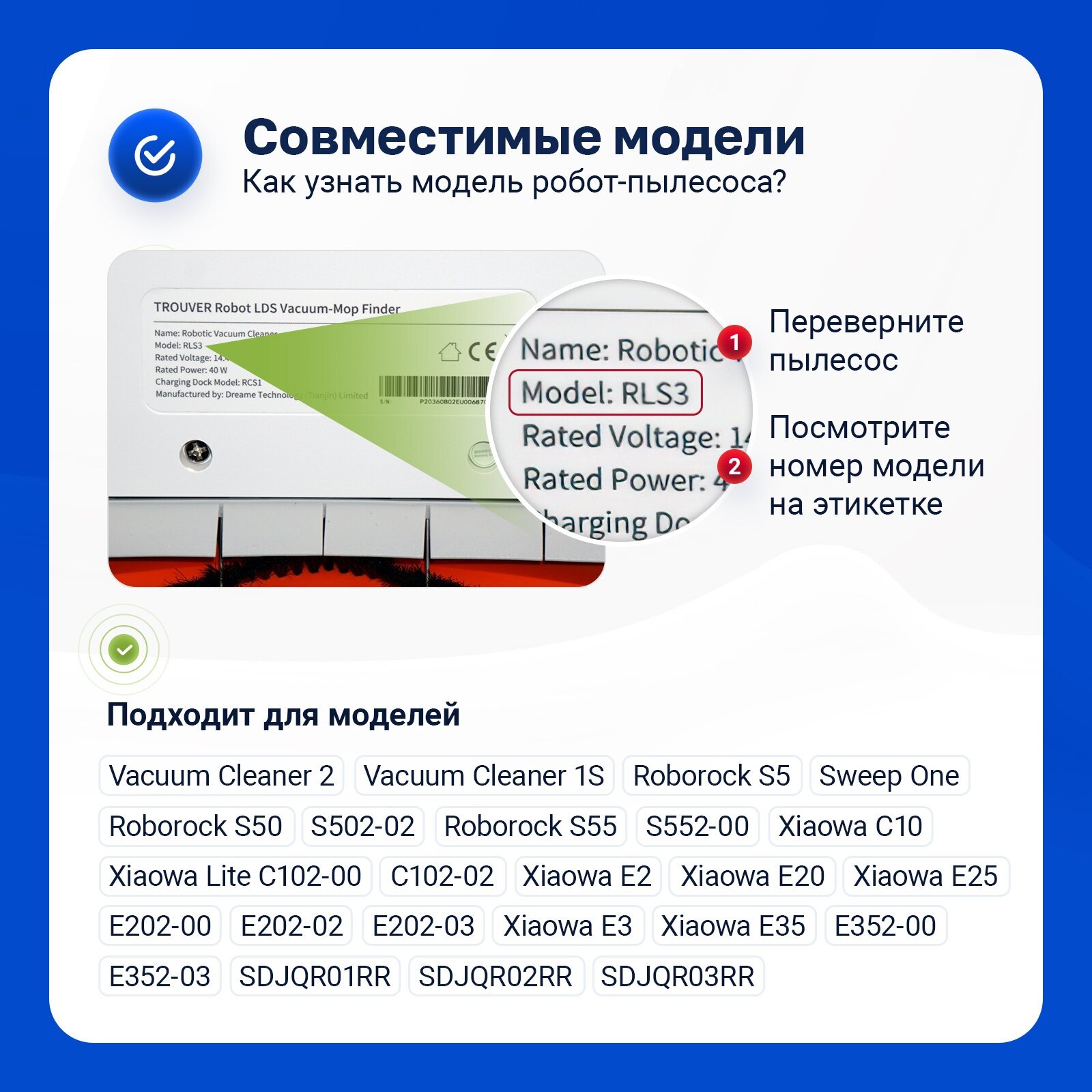 | Совместимые модели | Xiaomi, Roborock S5, S50, S51, s55, Xiaowa E2, E3, E4, E202-00, Vacuum Cleaner 2, Vacuum Cleaner 1S, S502-00, S502-02, SDJQR01RR, SDJQR02RR, SDJQR03RR, SKV4022GL, Cleaner lite, Sweep One |