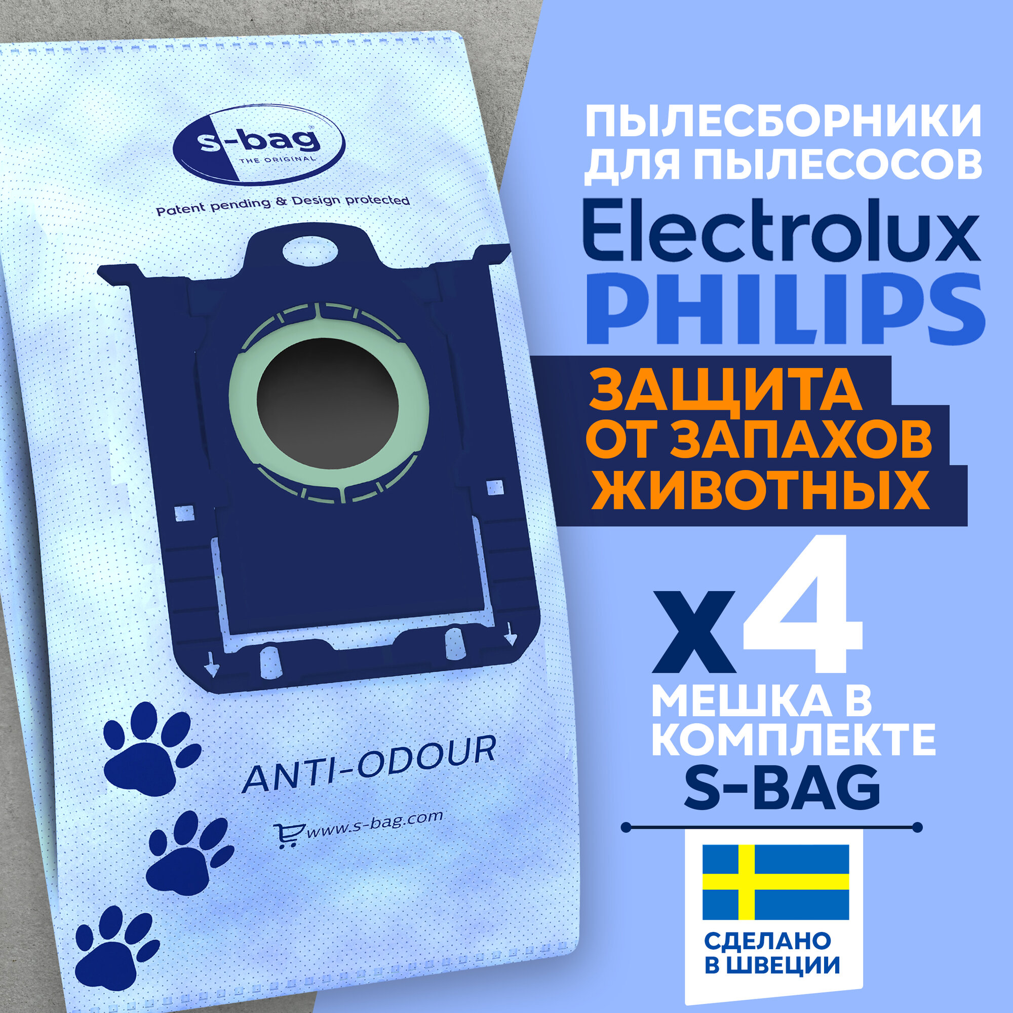 Мешки для пылесоса PHILIPS, ELECTROLUX E203S ANTI-ODOUR одноразовые пылесборники с защитой от запахов, s-bag, 4 ш. Оригинал! т. информация:
