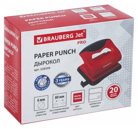 Дырокол BRAUBERG "JET PRO", до 20 листов, красно-черный, 228599 В комплекте: 1шт.