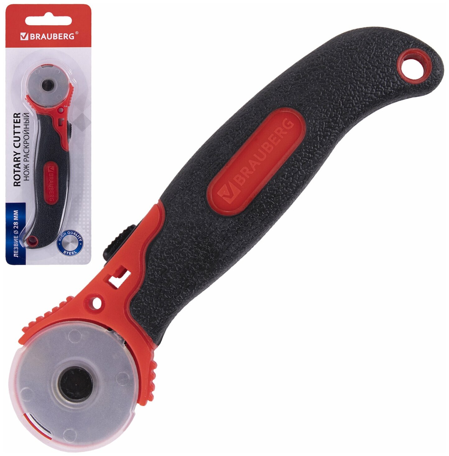 Нож раскройный роликовый 28мм Brauberg, круглое лезвие, резиновые вставки (238089)