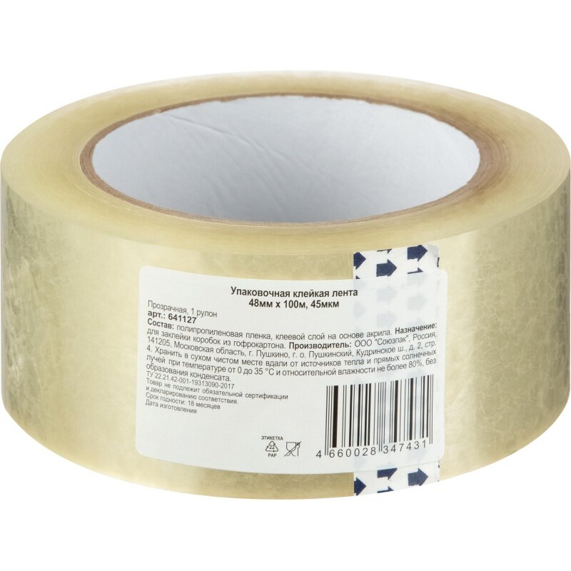 Клейкая лента упаковочная прозрачная 48 мм х 100 м толщина 45 мкм, 641127 366 ₽
