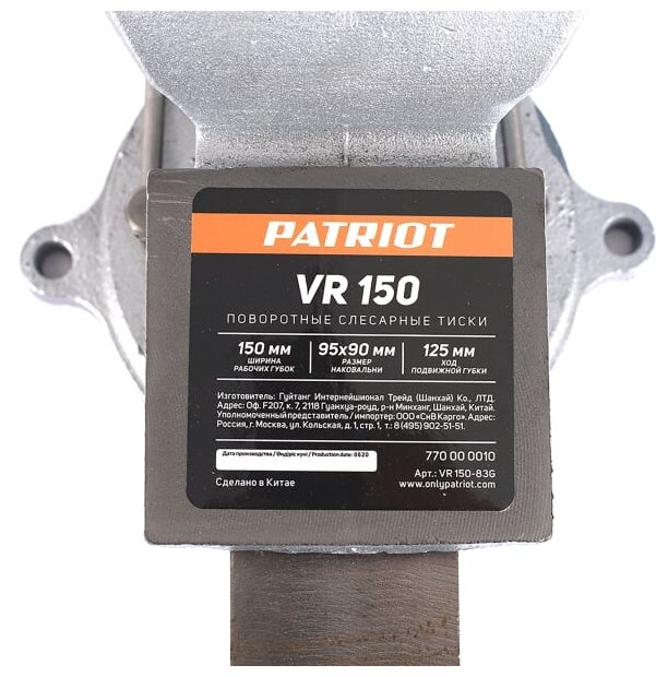 Поворотные слесарные тиски Patriot VR 150 информация: