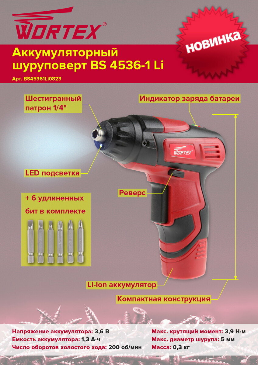 Отзывы на Аккум. шуруповерт WORTEX BS 4536-1 Li в блистере+ набор бит (1.3 А/ч Li-Ion, 1 скор., шурупы до 5 мм) (BS45361Li0823)