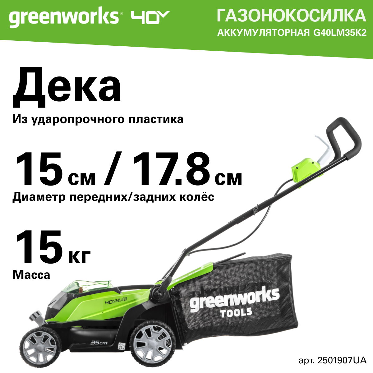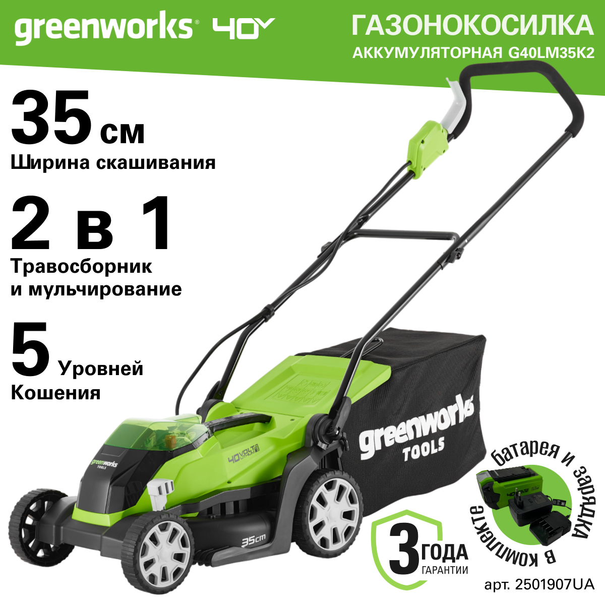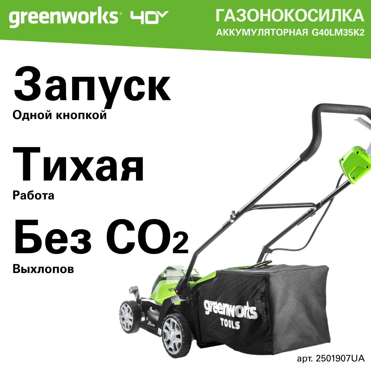Газонокосилка аккумуляторная Greenworks 2501907UA, 40V, G40LM35K2, 35 см, c 1хАКБ 2 А.ч и ЗУ