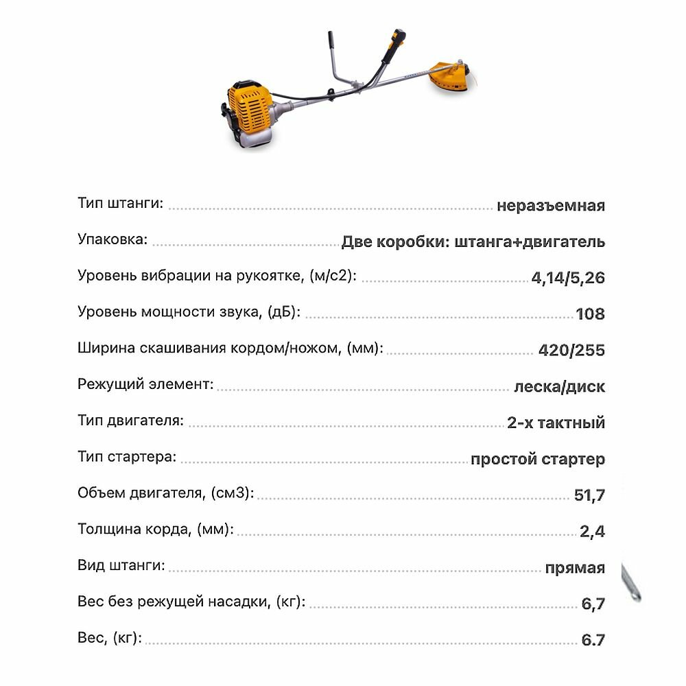 Триммер бензиновый Denzel DTL-52 52 см3, неразъемная штанга, состоит из 2 частей 96265