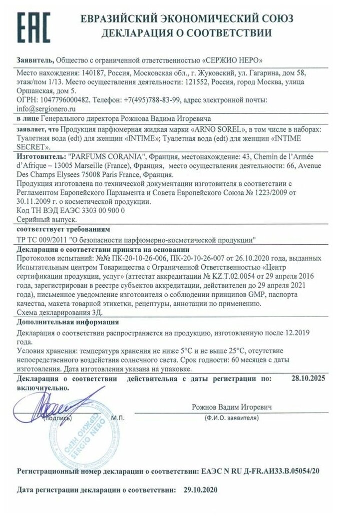Arno Sorel туалетная вода Intime Secret, 100 мл 1 460 ₽