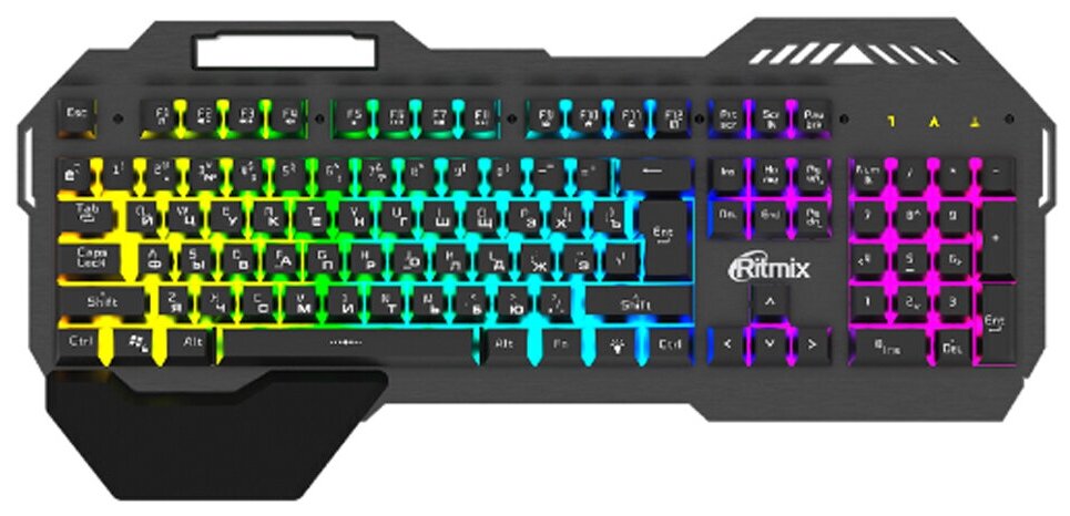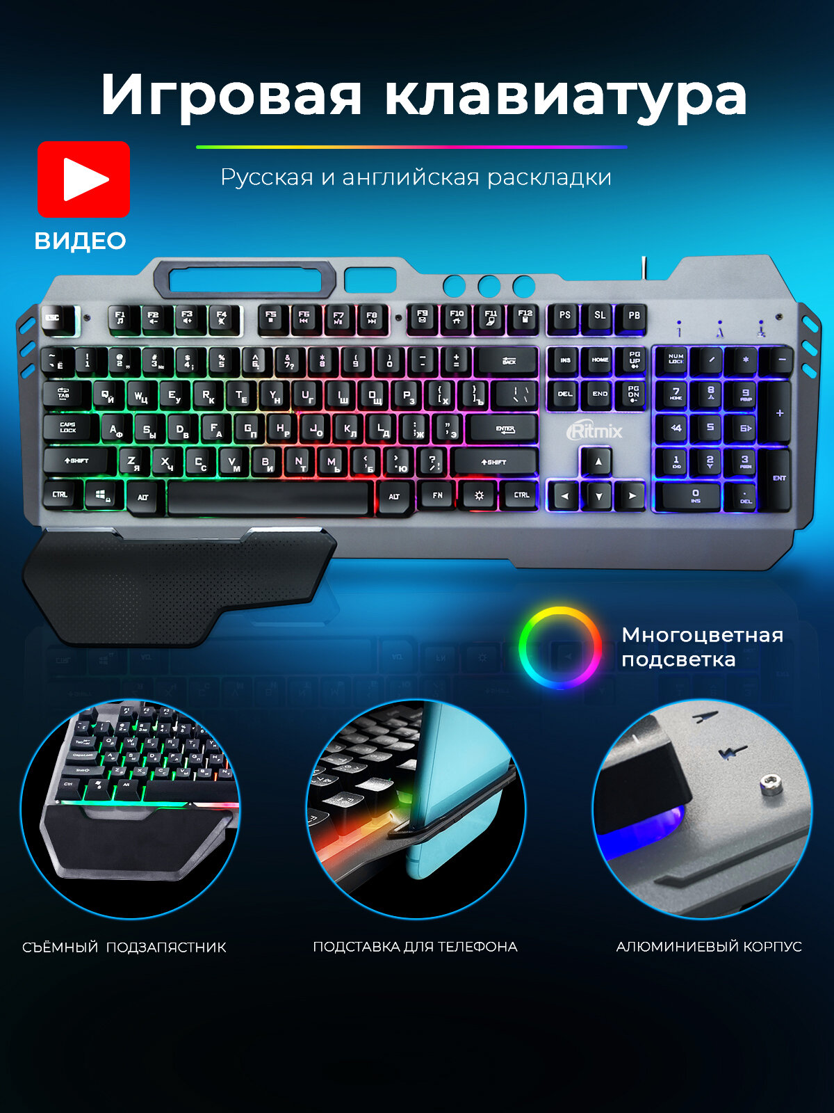 Клавиатура игровая RITMIX RKB-220BL,подсвет,магнит.подст запястье,металл,пласт.основ, USB,клав:104,мульт:12,каб:150 ±10см