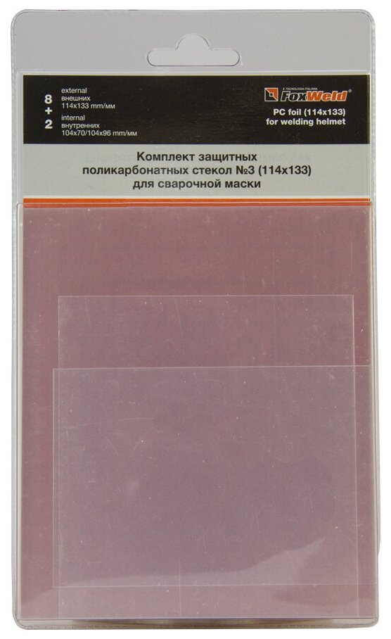 Foxweld Комплект поликарбонатных стекол №3 8 внешних 114x133мм, 1 внутреннее 104x70мм, 1 внутреннее 104x96мм, для масок GEFEST 5318 информация: