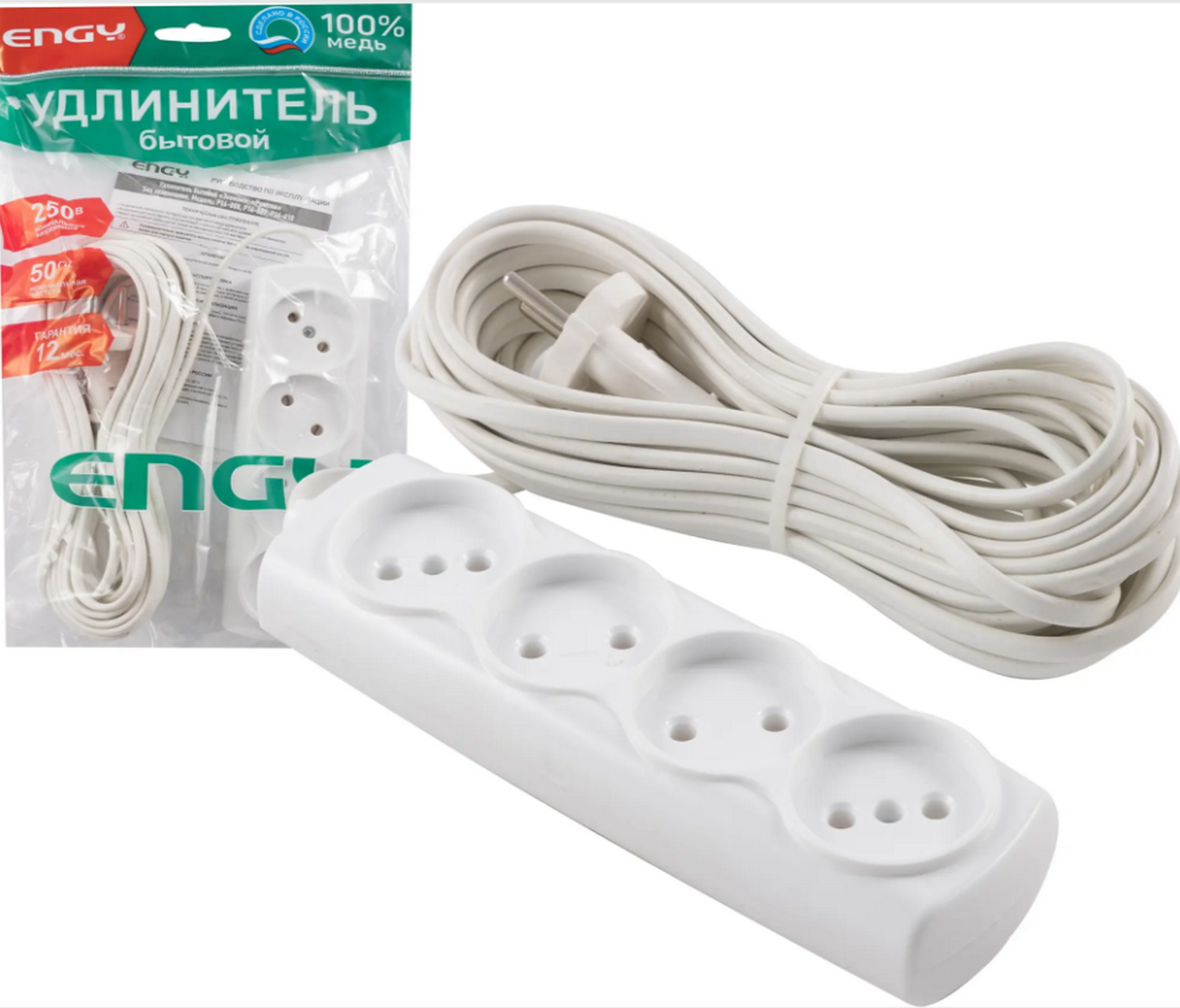 Удлинитель сетевой Engy P16-009 -4 розетки/10м б/з (белый) информация: