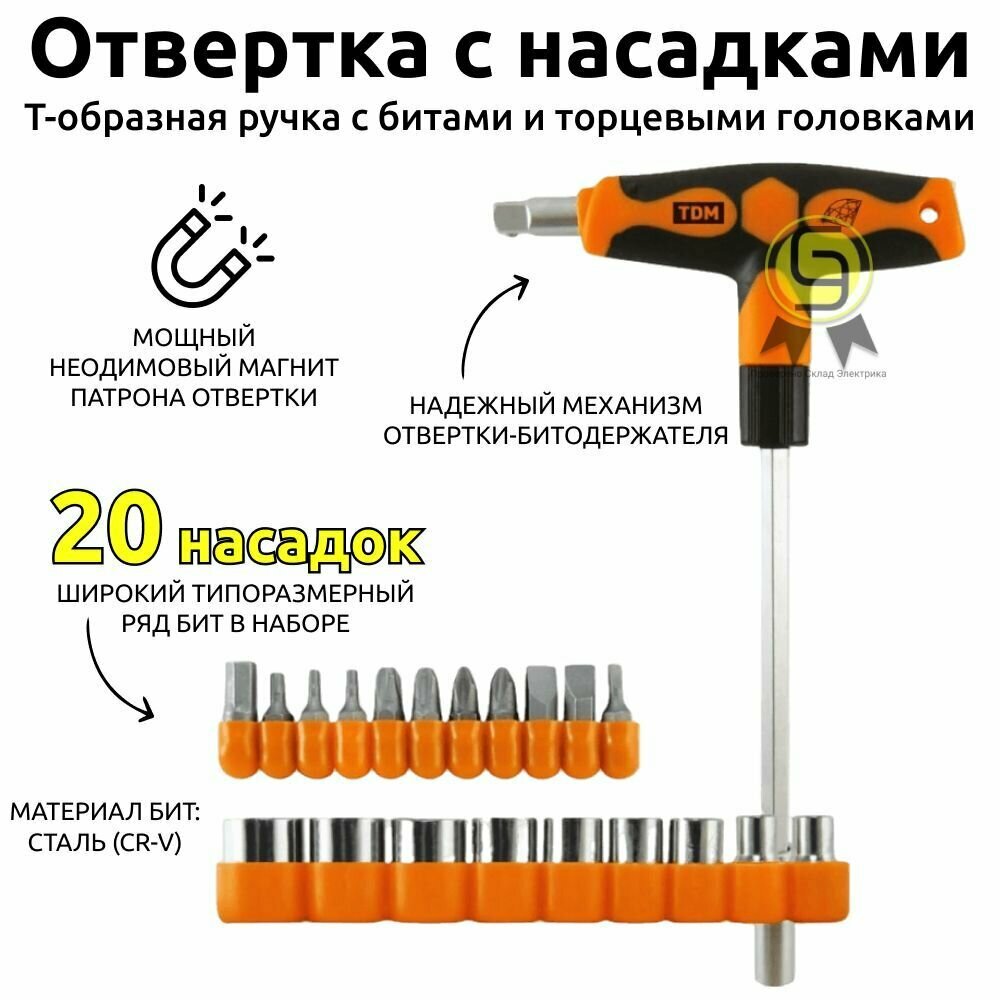 Набор, отвертка с Т-образной ручкой с битами и торцевыми головками, №3, 21 предмет "Алмаз" TDM SQ1019-0203 информация: