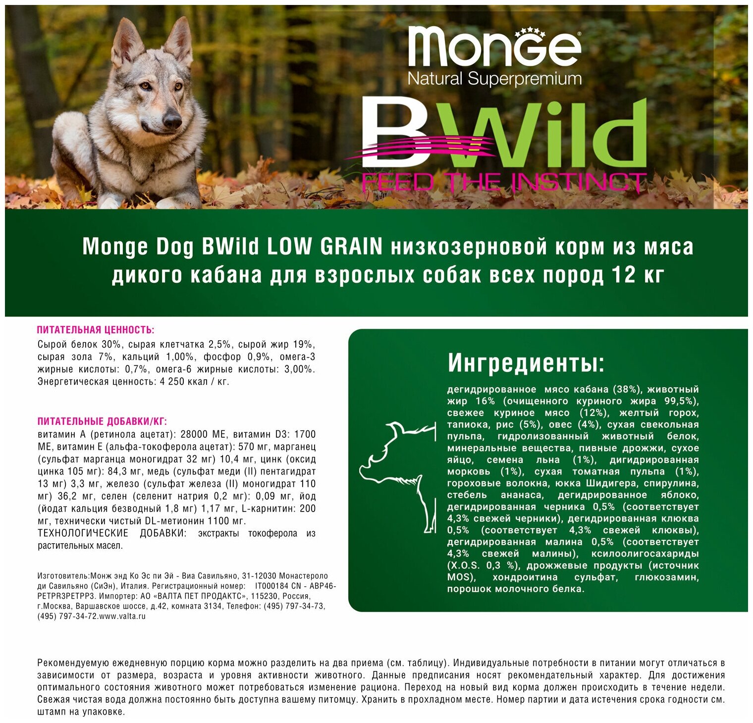 Сухой корм Monge Dog BWild LOW GRAIN, для взрослых собак, низкозерновой, из мяса дикого кабана 12 кг информация:
