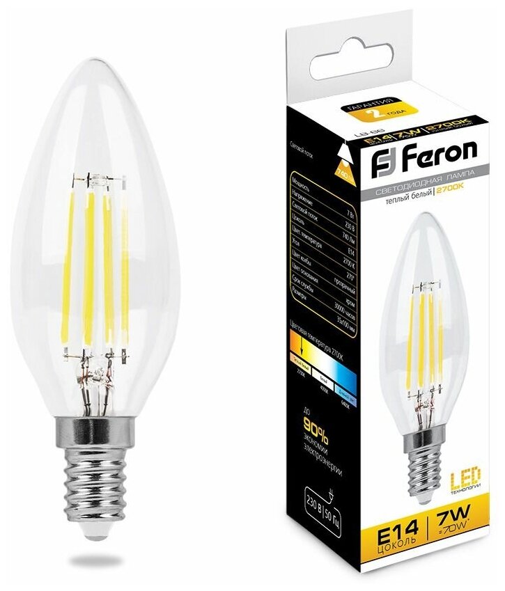 Лампа светодиодная LED 7вт Е14 теплый свеча FILAMENT | код. 25726 | FERON (10шт.в упак.)