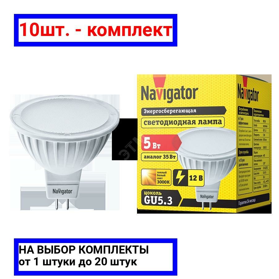 10 цен на Лампочка светодиодная Navigator NLL-MR16, 94262, GU5.3, 5W, 3000K, 12В, теплый свет (10шт)