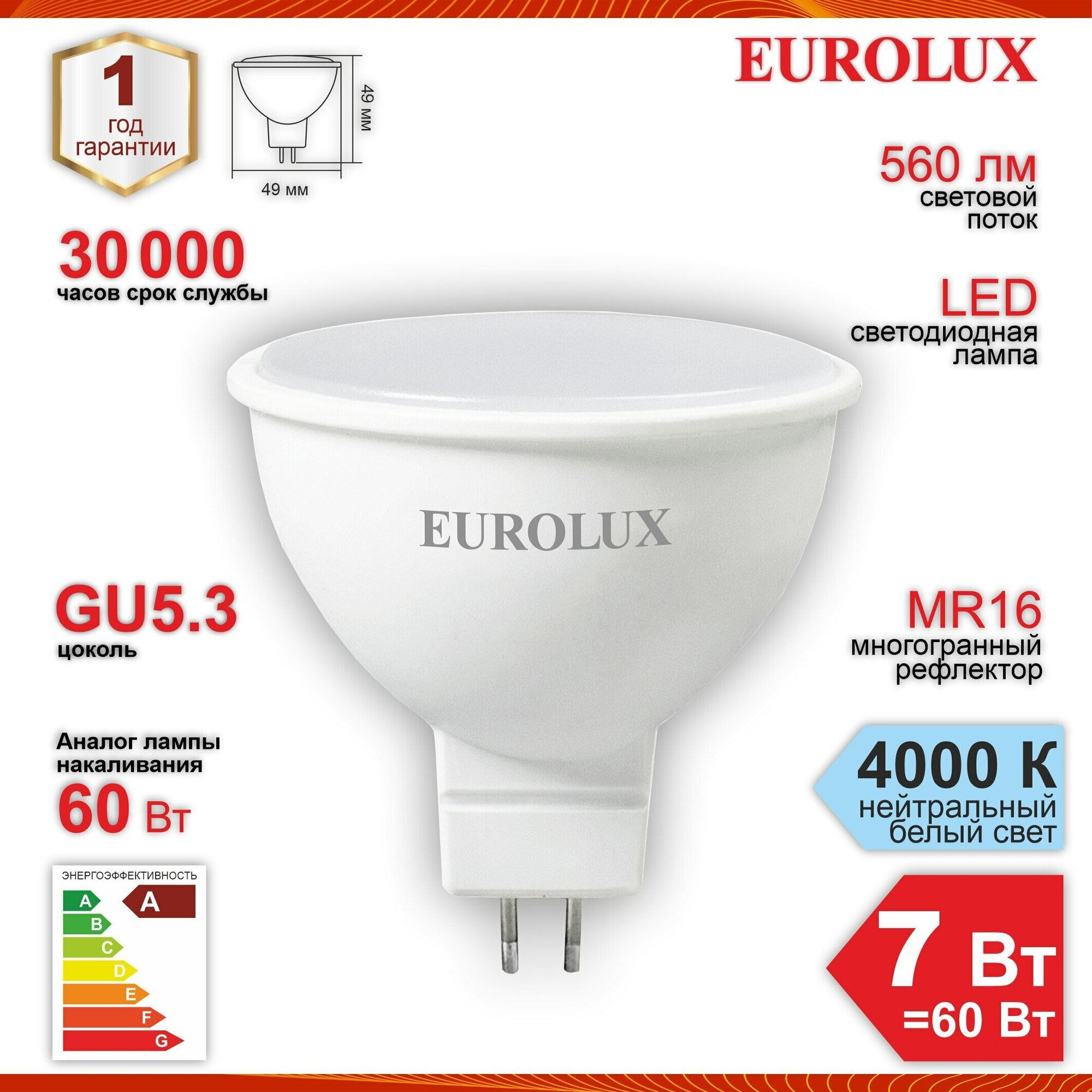 Отзывы на Eurolux Лампа светодиодная LL-E-MR16-7W-230-4K-GU5.3 /рефлектор, 7Вт, нейтр., GU5.3/ 76/2/24