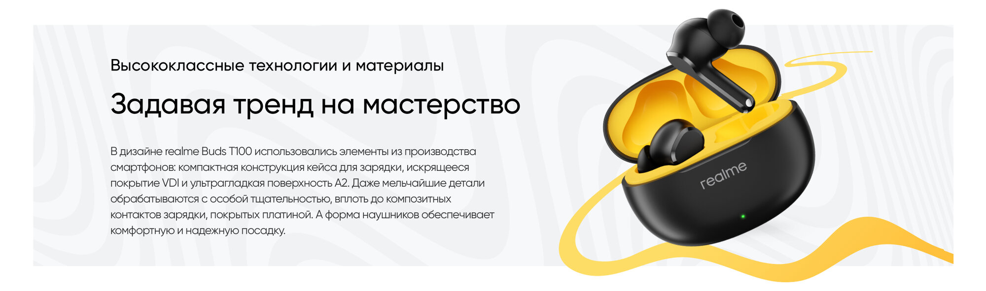 | Комплектация | realme Buds T100, руководство пользователя, амбушюры 6 шт |