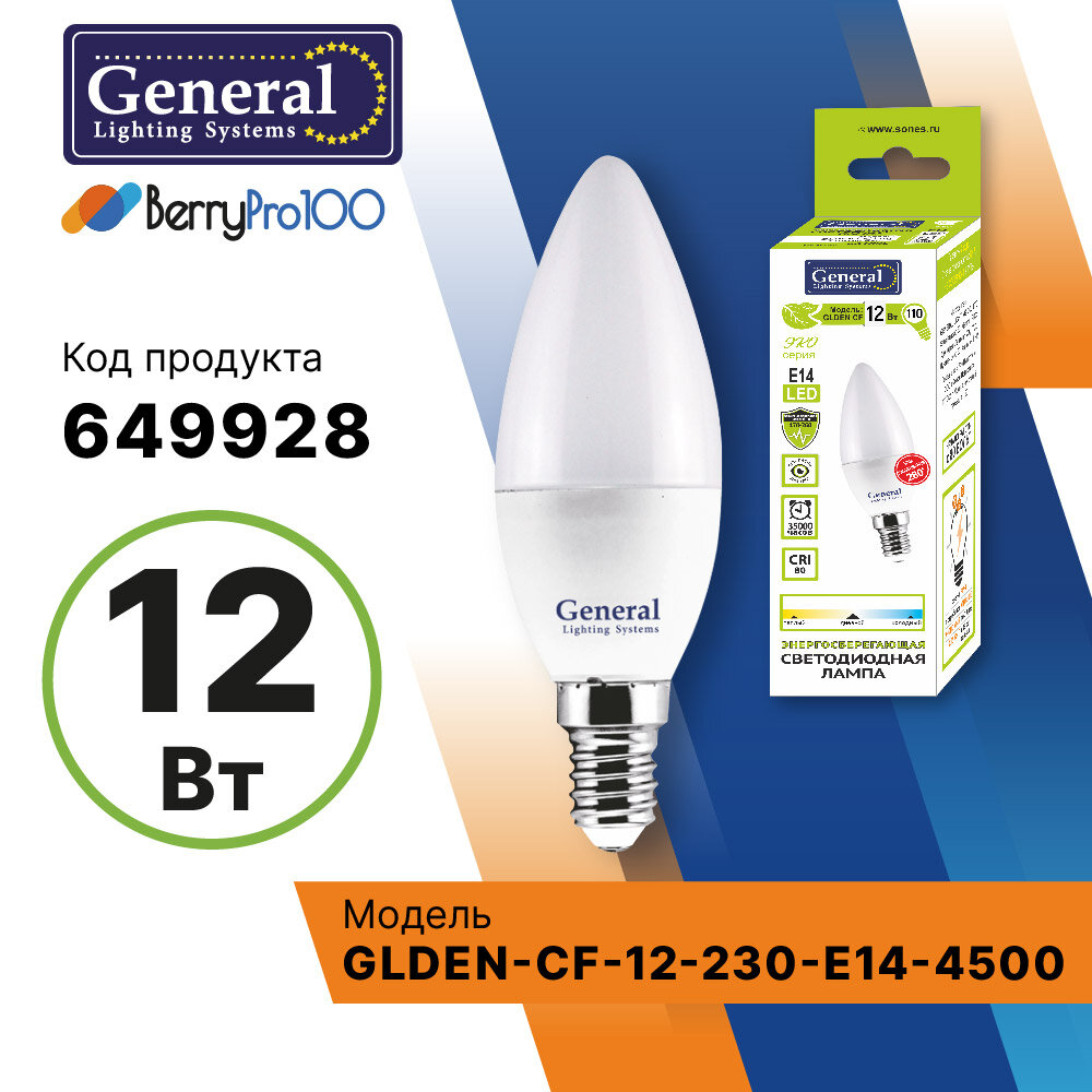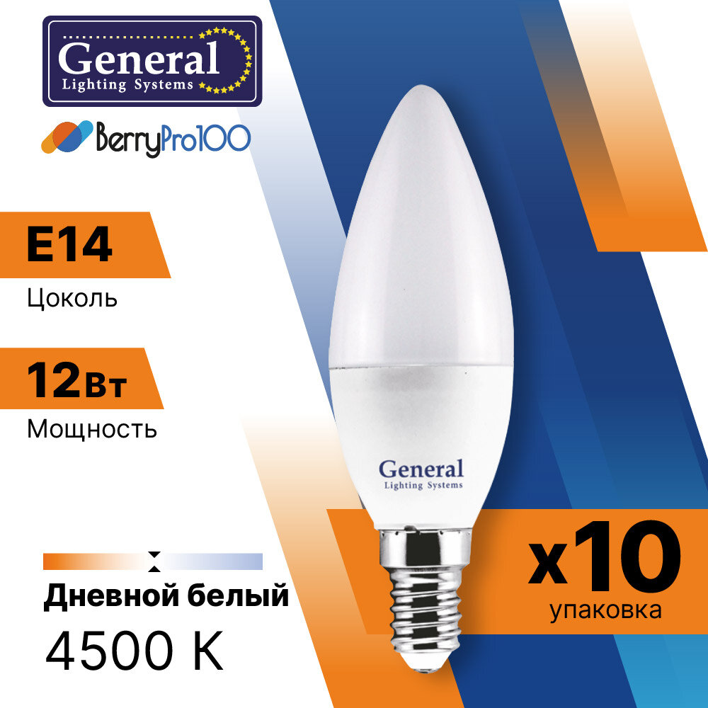(10шт)Лампочка светодиодная 12Вт свеча 4500К General 649928 GLDEN-CF-12-230-E14-4500 информация: