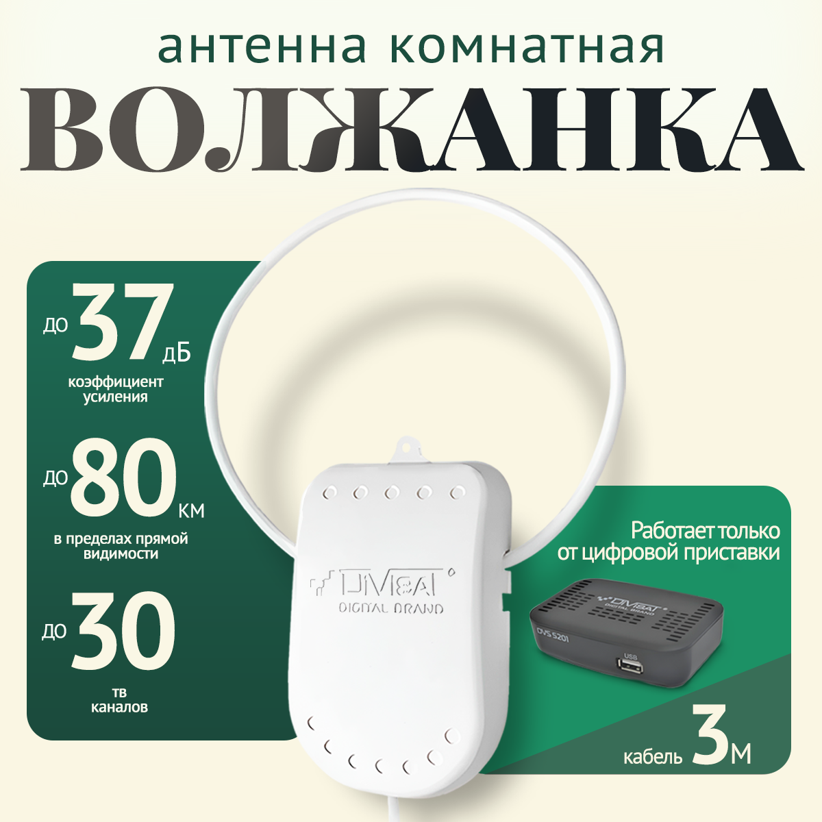 Divisat Антенна комнатная активная для цифрового тв Волжанка блоком 12В 3м с присоской