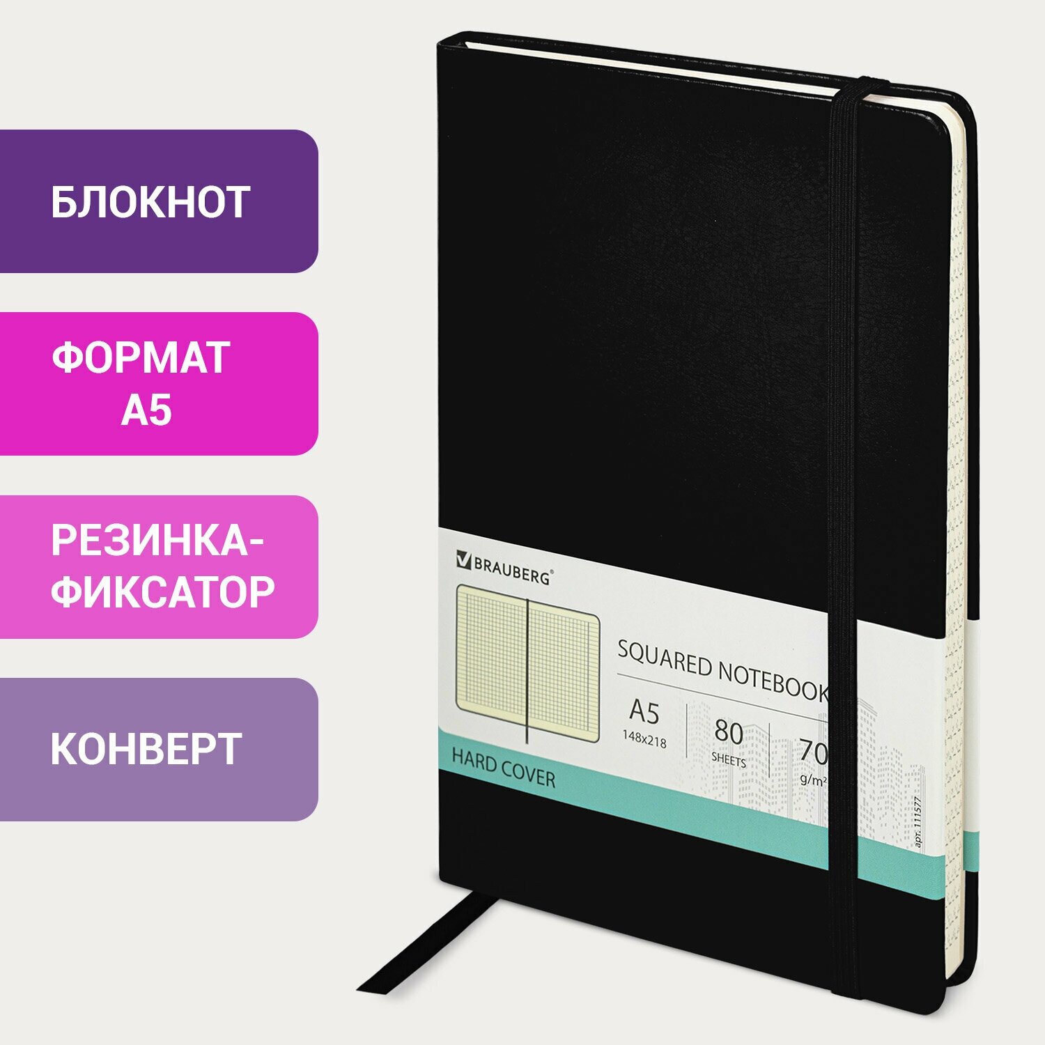 Блокнот А5 (148x218 мм), BRAUBERG "Metropolis Special", под кожу, 80 л., резинка, клетка, черный, 111577 В комплекте: 1шт. информация: